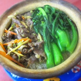 原料:泰国香米、牛肉、芥蓝、姜、红辣椒、芹菜、生抽、味精、生粉、油。