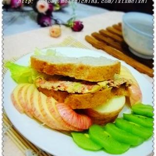 原料:全麦面包片、富士苹果、鸡蛋、西红柿、生菜叶、葱花。