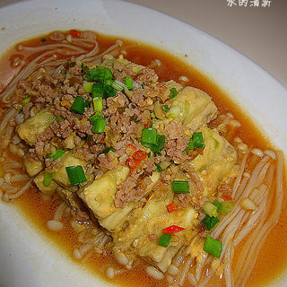 原料:茄子、金针菇、辣椒、猪肉、蒜头、葱、咸鸭蛋、油、盐、老抽、味精、冰糖。