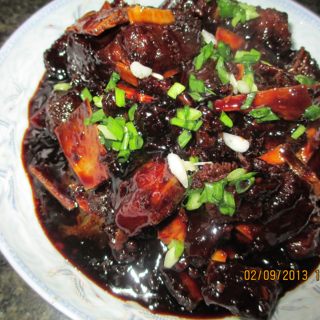 原料:猪排骨、葱、姜、盐、糖、料酒、胡椒粉、五香粉、香醋、水淀粉、玉米油。