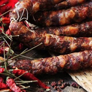 原料:猪后臀尖、盐、干辣椒、花椒、麻椒、白糖、高度白酒、生抽酱油、腌渍肠衣。