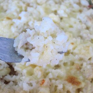原料:白米饭、鸡胸肉、洋葱、芝士粉、黑胡椒粉、幼盐、奶油、淡奶油、车达芝士。