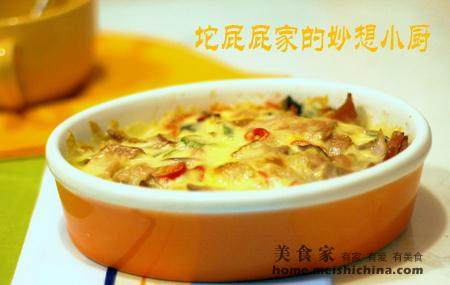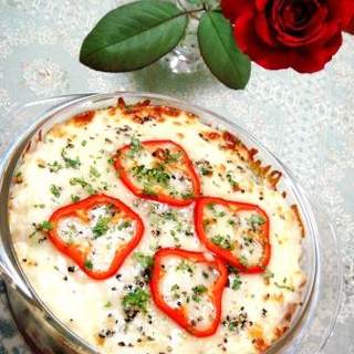 原料:米饭、奶酪丝、水浸金枪鱼罐头、西兰花、番茄、双孢菇、土豆泥、胡椒丝、大蒜、大葱、九层塔碎、盐、黑胡椒粉、橄榄油、淡奶油、黑胡椒碎。