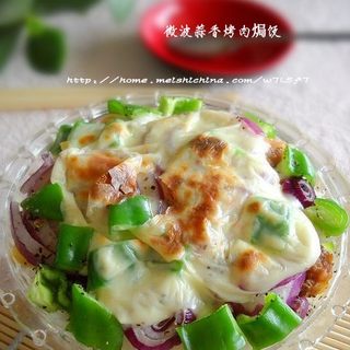原料:剩米饭、蒜香烤肉 、洋葱、青椒、黑胡椒 、奶酪 。