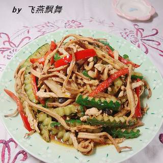 原料:干鱿鱼丝、黄瓜、瘦肉、红椒、姜丝、蒜片、香辣豆豉酱、调味汁、干辣椒、香醋、胡椒粉、玉米油。