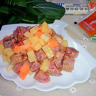 原料:土豆、牛肉、胡萝卜、原味丘比沙拉酱、美式甜辣味丘比沙拉汁。