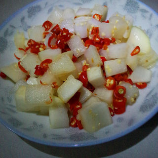 原料:水萝卜、盐、生抽、白糖、食醋、老干妈辣椒酱、香油、大蒜。
