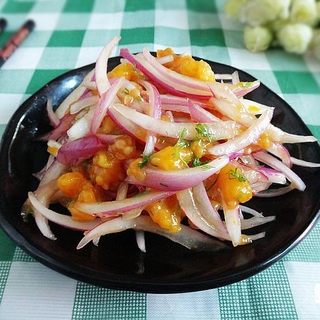 原料:洋葱、树番茄、青柠檬、鱼露、白糖、香菜。