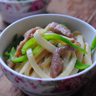 原料:茭白、瘦肉、青椒、油、盐、料酒、生抽、黑胡椒粉、生粉。