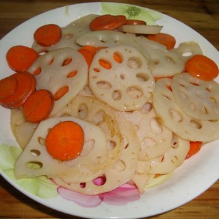 原料:莲藕、小红萝卜、白醋、白糖、盐、清水、油。