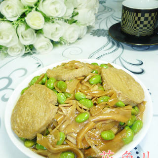 原料:毛豆、水笋、素鸡、生抽、白糖、盐、鸡精。
