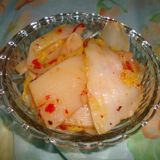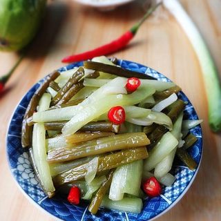 原料:酸竹笋、白菜、辣椒酱、辣椒花椒油、白醋、盐、熟油。