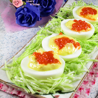 原料:熟鸡蛋、鱼子酱、包心菜、洋葱、蛋黄酱。