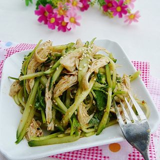 原料:鸡胸肉、黄瓜、香菜、熟芝麻、盐、鸡精、白糖、醋、辣油、麻油、酱油。