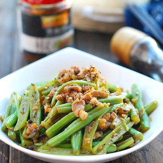 原料:四季豆、五花肉、大蒜、味极鲜、李锦记黑椒汁。
