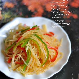 原料:土豆、青红椒、精盐、红油、凉拌醋、酱油、香油。