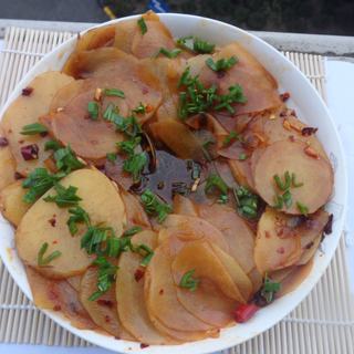 原料:土豆、老抽、醋、糖、盐、老干妈辣酱、香油、胡椒粉、蒜泥、春菜、生抽。