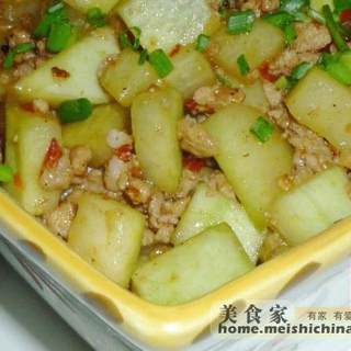 原料:西瓜皮、肉糜、蒜末、辣酱、甜面酱、花椒粉。