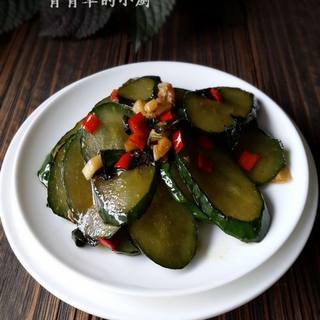 原料:黄瓜、紫苏、红辣椒、蒜头、油、盐、蚝油、生抽。