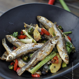 原料:小鱼、精盐、植物油、豆豉、红尖椒、青尖椒、小葱、生姜、香菜。
