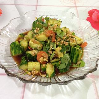 原料:黄瓜、虾米、香菜、香油、蒜蓉、生抽、盐。
