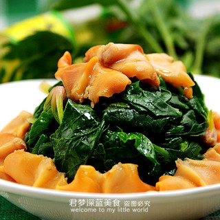 原料:赤贝肉、小菠菜、陈醋、芥末油、生抽、盐、糖、香油。
