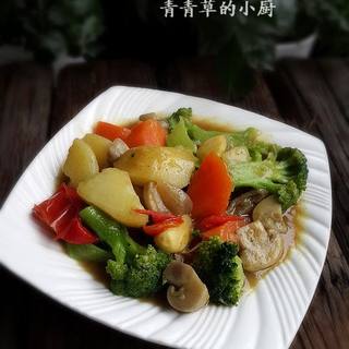 原料:土豆、西兰花、胡萝卜、口蘑、红辣椒、红葱头、蒜、咖喱块、高汤或清水、油。
