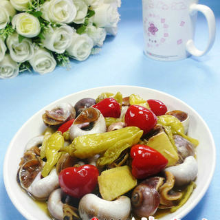 原料:肉螺、小米辣泡椒、红泡椒、姜片、料酒、白糖、鸡精。