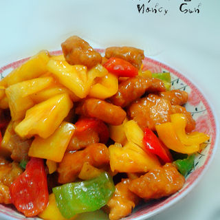 原料:猪肉、菠萝、青椒、黄椒、红椒、椒盐。