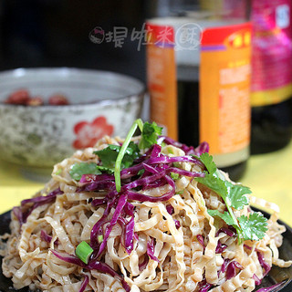 原料:干豆腐丝、紫甘兰、香菜、葱、大葱、生抽、香醋、食盐、香油、食用油。