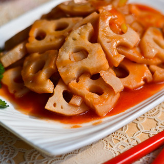 原料:莲藕、葱、香菜、亨氏蕃茄酱、盐、烹调油、糖。