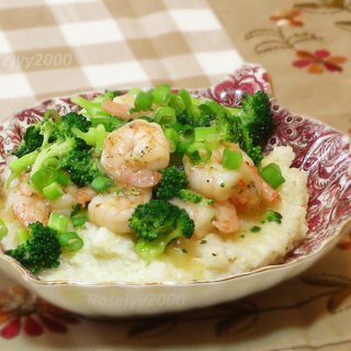 原料:冰冻虾、西兰花、玉米粥粉Grits、葱、新鲜欧芹、干萝勒、干欧芹、干百里香、盐、糖、胡椒粉、玉米淀粉、料酒、麻油。