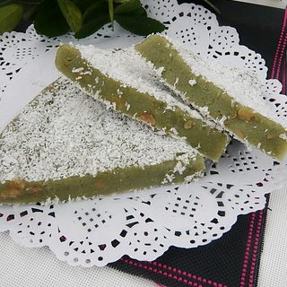 原料:糯米粉、澄粉、奶粉、椰蓉、白糖、绿茶粉、核桃仁。