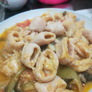 原料:猪大肠、西红柿、酸菜、盐、面粉、蒜头、蒜苗、油、白醋、淀粉、小米辣。