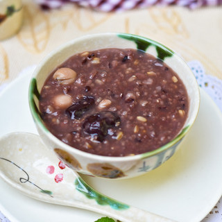 原料:黑米、糯米、红豆、绿豆、花生、葡萄干、薏米、桂圆、莲子、红枣、冰糖。