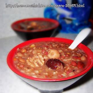 原料:糯米、薏米、黑米、红小豆、莲子、百合、葡萄干、红枣、枸杞、冰糖。