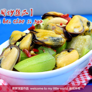 原料:贻贝、丝瓜、葱、姜、蒜、红椒、生抽、盐、料酒。