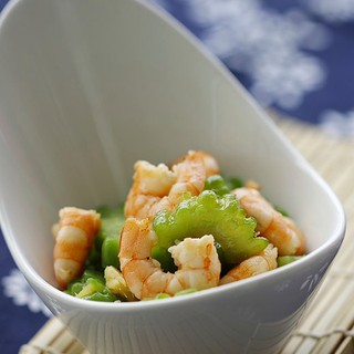 原料:鲜虾、苦瓜、姜片、料酒、淀粉、油、盐。