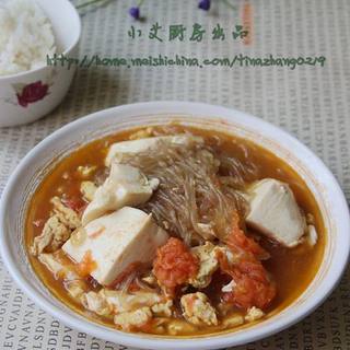原料:西红柿、鸡蛋、红薯粉条、嫩豆腐、大蒜、盐、生抽、糖、油。