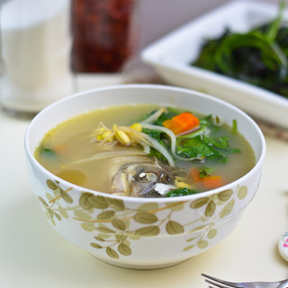 原料:鱼头、鱼骨、红萝卜、黄豆芽、荆芥、葱、姜、盐、烹调油、胡椒粉。
