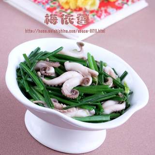 原料:小章鱼、韭菜葶、姜丝、盐、料酒。