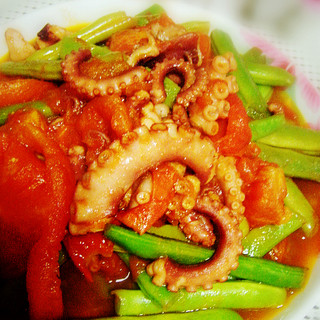 原料:鱿鱼、番茄、四季豆、姜、干辣椒、料酒、生抽、糖 、米醋、玉米油。