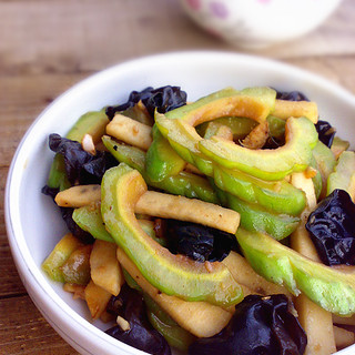 原料:山药、云耳、苦瓜、姜、蒜、色拉油、海鲜酱、盐、蚝油、鸡粉、酒。