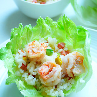 原料:米饭、鲜虾、玉米、香肠、黄瓜、鸡蛋清、淀粉、小葱、盐、料酒、胡椒粉、鸡精、香油、味极鲜。