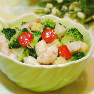 原料:扇贝肉、虾仁、西兰花、玉米芯、红菜椒、小泡椒、蒜茸、精盐、胡椒粉、玉米淀粉、料酒、白葡萄酒、芝麻油。