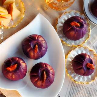 原料:紫薯泥、糯米粉、玉米淀粉、绿豆沙馅、白糖、枸杞子。