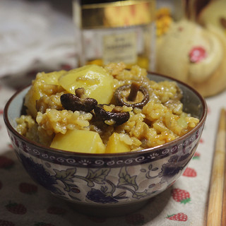 原料:大米、大茄子、小香菇、土豆、猪肉、油、酱油。