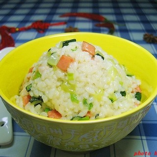 原料:隔夜米饭、黄瓜、火腿肠、小葱、盐、鸡精。
