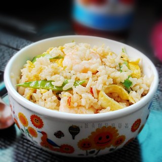 原料:米饭、鲜虾、鸡蛋、荷兰豆、葱、蒜、青柠檬。