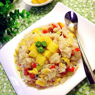 原料:菠萝、米饭、青豆、黄瓜、胡萝卜、火腿肠、鸡蛋、盐、鸡精。